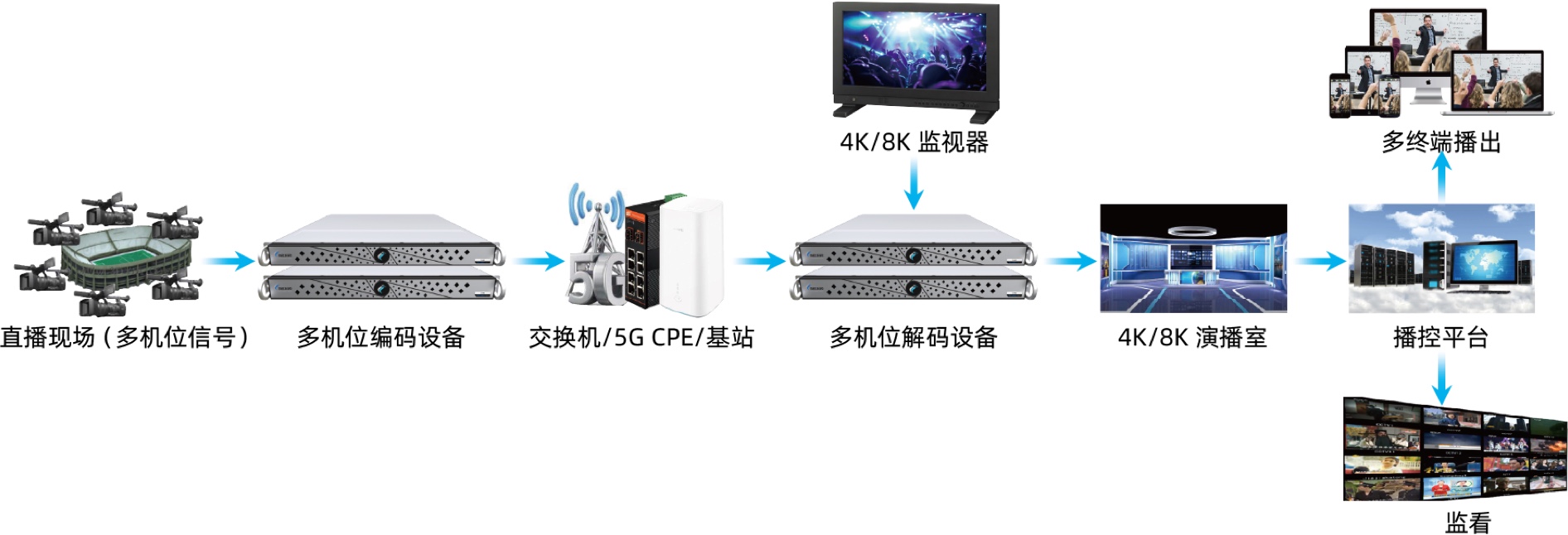 平台提供了真正的一站式远程制作解决方案,其中包括了现场多机位信号稳定回传、中心端多机位高质量及个性化制作、播控端多终端安全播出等 3 大环节,以支持多样化、专业级的 5G+4K/8K 远程制作业务场景。