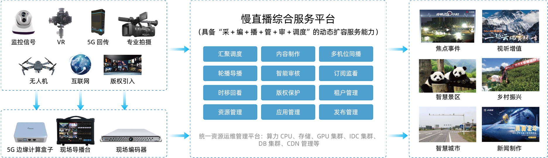平台提供了真正的一站式慢直播解决方案,其中包括了慢直播信号 回传、直点播加工生产及内容制作、全媒体全平台分发、互动增值、 多租户管理、多元化服务等能力,以支持多样化的慢直播相关业务场景。
